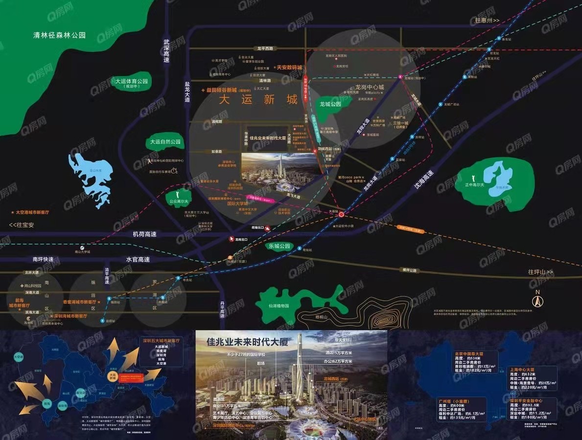 項目距離16號線(在建)龍城西站僅約400米,坐攬大運交匯樞紐(在建),3號線、14號線(在建)、16號線(在建)、深惠城際線(規劃中)、21號線(規劃中)、33號線(規劃中)六軌交匯,周邊更環聚鹽龍大道、外環高速(在建)、水官高速、機荷高速等,高效通達全城,實現灣區1小時生活圈。
